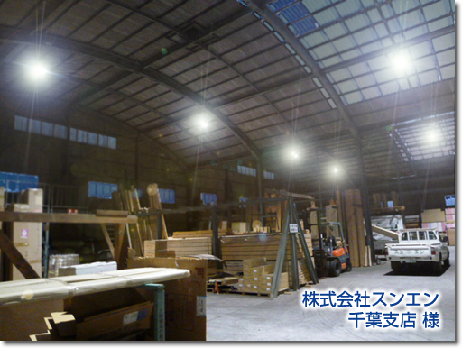 株式会社スンエン 千葉支店 様 業態:材木商 エリア:千葉県 設置場所:工場内天井 交換前の照明:水銀灯400W 交換後の照明: LM400-60 数量:12個
